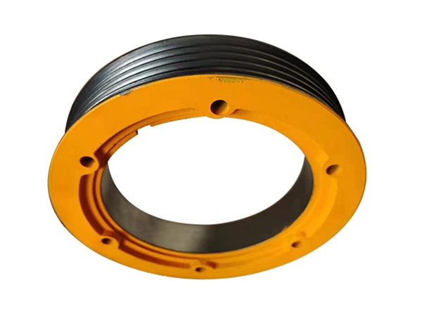 反繩輪通常是一個(gè)堅(jiān)固的鑄鐵或鑄鋼輪體,表面開有與曳引輪相匹配的繩槽(多為U型或V型帶切口)。其輪轂通過軸承支撐在固定軸上,確保輪子能靈活轉(zhuǎn)動(dòng),減少鋼絲繩的磨損。反繩輪的設(shè)計(jì)需考慮承受鋼絲繩的巨大張力、頻繁的彎曲應(yīng)力以及長期運(yùn)行的磨損,因此其材質(zhì)、加工精度、潤滑和安裝牢固性都至關(guān)重要。
